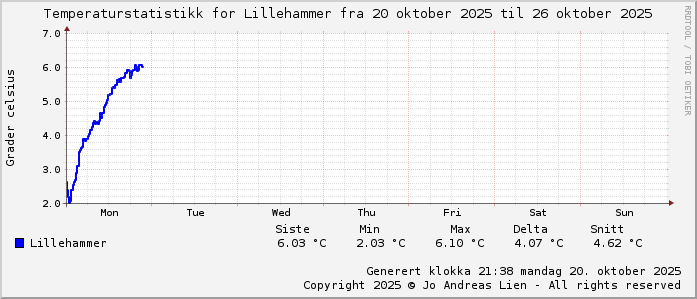 Høyeste temperatur | 6.0°C | 17:35 mandag 20 oktober | 13.8°C | 15:55 mandag 21 oktober | 7.4°C | 15:35 tirsdag 24 oktober |