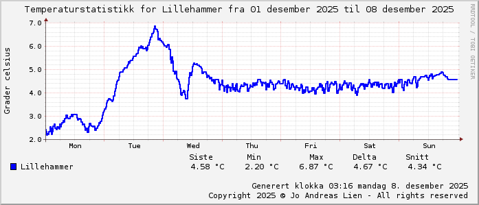 | Snitt temperatur | 6.8°C | 518 avlesninger | 4.5°C | 1144 avlesninger | ||