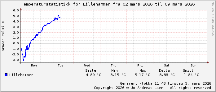 | Høyeste temperatur | 5.2°C | 10:25 tirsdag 03 mars | 9.8°C | 12:45 torsdag 06 mars | 5.0°C | 14:25 mandag 04 mars |