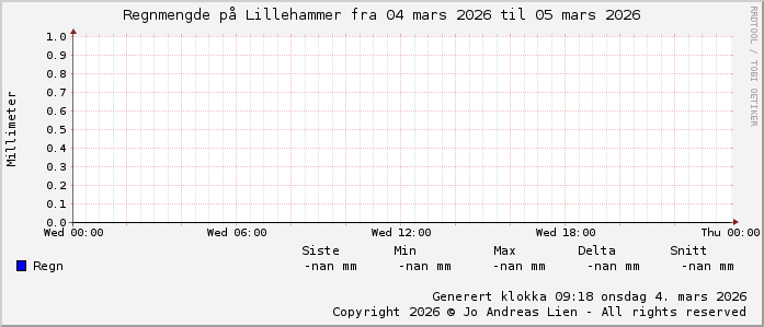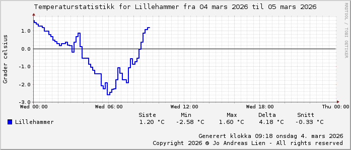 Temp -0.5°C og Vind 0.0m/s Oppdatert klokka 07:55 MinTemp -2.6°C (06:05) MaxTemp 1.6°C (00:05) MiddelTemperatur -0.5°C GjennomsnittsTemp -0.4°C (47 avlesninger) Målt på Lillehammer av joli Navnedag: Ada, Adrian Stjernetegnet er Fiskene ![]() Kinesisk år er