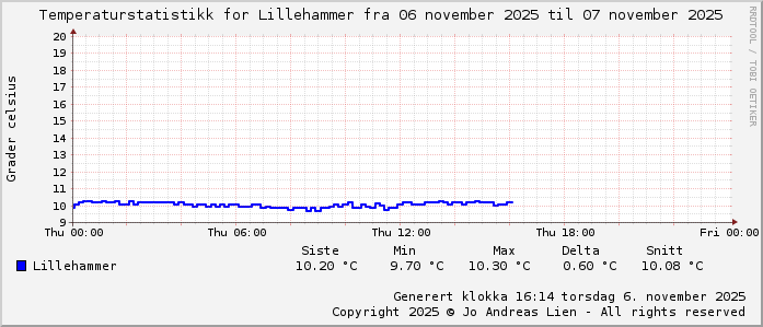 Temp 10.1°C og Vind 0.0m/s Oppdatert klokka 14:25 MinTemp 9.7°C (08:45) MaxTemp 10.3°C (00:35) MiddelTemperatur 10°C GjennomsnittsTemp 10.1°C (86 avlesninger) Målt på Lillehammer av joli Navnedag: Lennart, Leonard Stjernetegnet er Skorpionen ![]() Kinesisk år er