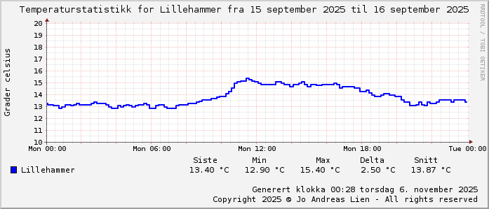 MinTemp 12.9°C (00:55) MaxTemp 15.4°C (11:35) MiddelTemperatur 14.2°C GjennomsnittsTemp 7°C (143 avlesninger) Målt på Lillehammer av joli Navnedag: Aslak, Eskil Stjernetegnet er Jomfruen ![]() Kinesisk år er