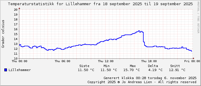 MinTemp 11.7°C (04:05) MaxTemp 15.7°C (16:45) MiddelTemperatur 13.7°C GjennomsnittsTemp 7°C (143 avlesninger) Målt på Lillehammer av joli Navnedag: Henriette, Henry Stjernetegnet er Jomfruen ![]() Kinesisk år er