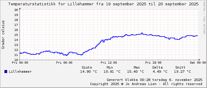 MinTemp 10.9°C (06:25) MaxTemp 15.4°C (16:35) MiddelTemperatur 13.2°C GjennomsnittsTemp 7°C (143 avlesninger) Målt på Lillehammer av joli Navnedag: Connie, Konstance Stjernetegnet er Jomfruen ![]() Kinesisk år er