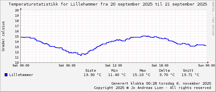 MinTemp 11.4°C (07:55) MaxTemp 15.1°C (15:55) MiddelTemperatur 13.3°C GjennomsnittsTemp 7°C (143 avlesninger) Målt på Lillehammer av joli Navnedag: Tage, Tobias Stjernetegnet er Jomfruen ![]() Kinesisk år er