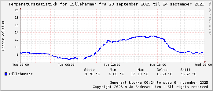 MinTemp 6.6°C (07:45) MaxTemp 13.1°C (17:15) MiddelTemperatur 9.9°C GjennomsnittsTemp 7°C (143 avlesninger) Målt på Lillehammer av joli Navnedag: Snefrid, Snorre Stjernetegnet er Jomfruen ![]() Kinesisk år er