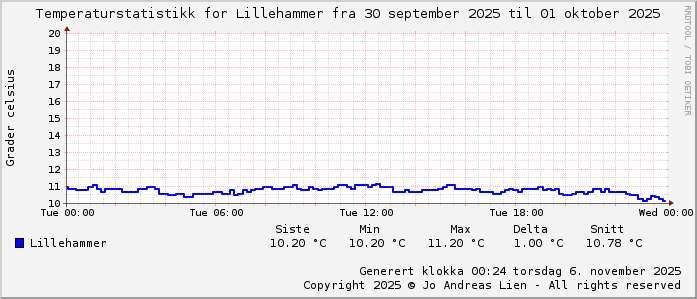 MinTemp 10.2°C (23:15) MaxTemp 11.2°C (12:35) MiddelTemperatur 10.7°C GjennomsnittsTemp 7°C (143 avlesninger) Målt på Lillehammer av joli Navnedag: Hege, Helga, Helge Stjernetegnet er Vekten ![]() Kinesisk år er