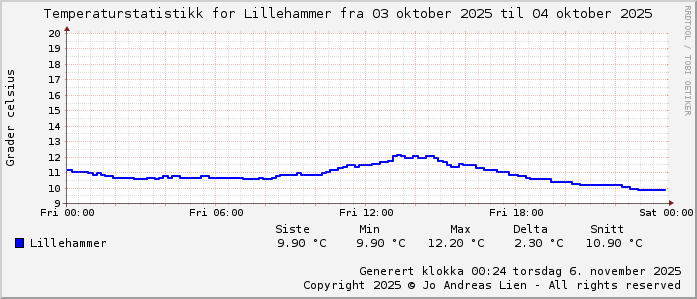 MinTemp 9.9°C (23:05) MaxTemp 12.2°C (13:25) MiddelTemperatur 11.1°C GjennomsnittsTemp 7°C (143 avlesninger) Målt på Lillehammer av joli Navnedag: Evald, Evelyn Stjernetegnet er Vekten ![]() Kinesisk år er