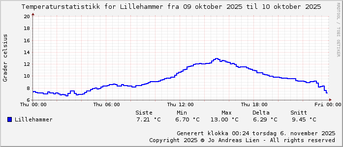 MinTemp 6.7°C (02:55) MaxTemp 13.0°C (15:05) MiddelTemperatur 9.9°C GjennomsnittsTemp 7°C (143 avlesninger) Målt på Lillehammer av joli Navnedag: Leidulf, Leif Stjernetegnet er Vekten ![]() Kinesisk år er