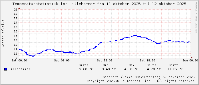 MinTemp 9.4°C (02:05) MaxTemp 14.1°C (16:15) MiddelTemperatur 11.8°C GjennomsnittsTemp 7°C (143 avlesninger) Målt på Lillehammer av joli Navnedag: Kennet, Kent, Kevin Stjernetegnet er Vekten ![]() Kinesisk år er