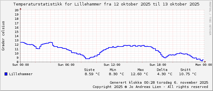 MinTemp 8.3°C (23:55) MaxTemp 12.6°C (00:05) MiddelTemperatur 10.5°C GjennomsnittsTemp 7°C (143 avlesninger) Målt på Lillehammer av joli Navnedag: Valter, Vibeke Stjernetegnet er Vekten ![]() Kinesisk år er