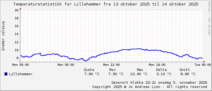 MinTemp 7.3°C (08:45) MaxTemp 10.4°C (15:35) MiddelTemperatur 8.9°C GjennomsnittsTemp 7°C (143 avlesninger) Målt på Lillehammer av joli Navnedag: Tarjei, Terje, Torgeir Stjernetegnet er Vekten ![]() Kinesisk år er