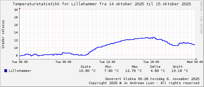 MinTemp 7.9°C (00:05) MaxTemp 12.8°C (18:25) MiddelTemperatur 10.4°C GjennomsnittsTemp 7°C (143 avlesninger) Målt på Lillehammer av joli Navnedag: Kai, Kaia Stjernetegnet er Vekten ![]() Kinesisk år er
