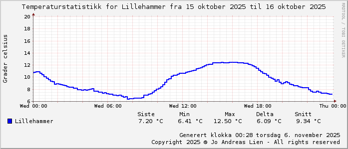 MinTemp 6.4°C (07:45) MaxTemp 12.5°C (15:15) MiddelTemperatur 9.5°C GjennomsnittsTemp 7°C (143 avlesninger) Målt på Lillehammer av joli Navnedag: Hedda, Hedvig Stjernetegnet er Vekten ![]() Kinesisk år er