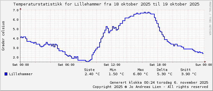 MinTemp 1.5°C (08:55) MaxTemp 6.8°C (16:25) MiddelTemperatur 4.2°C GjennomsnittsTemp 3.9°C (143 avlesninger) Målt på Lillehammer av joli Navnedag: Kjersti, Kjerstin Stjernetegnet er Vekten ![]() Kinesisk år er
