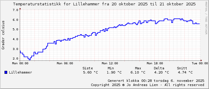MinTemp 1.9°C (01:25) MaxTemp 6.1°C (19:25) MiddelTemperatur 4°C GjennomsnittsTemp 4.7°C (143 avlesninger) Målt på Lillehammer av joli Navnedag: Henrik, Herman, Henrikke Stjernetegnet er Vekten ![]() Kinesisk år er