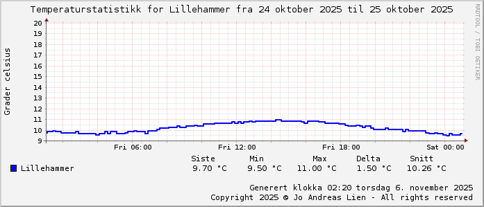 MinTemp 9.6°C (04:05) MaxTemp 11.0°C (14:25) MiddelTemperatur 10.3°C GjennomsnittsTemp 7°C (143 avlesninger) Målt på Lillehammer av joli Navnedag: Eilif, Eivor Stjernetegnet er Skorpionen ![]() Kinesisk år er