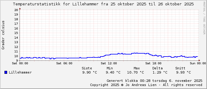 MinTemp 9.4°C (04:15) MaxTemp 10.7°C (15:35) MiddelTemperatur 10.1°C GjennomsnittsTemp 7°C (143 avlesninger) Målt på Lillehammer av joli Navnedag: Margrete, Merete, Marta Stjernetegnet er Skorpionen ![]() Kinesisk år er