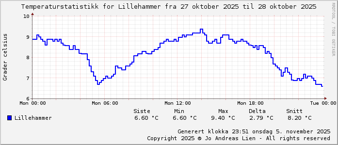 MinTemp 6.7°C (05:35) MaxTemp 9.4°C (14:05) MiddelTemperatur 8.1°C GjennomsnittsTemp 7°C (143 avlesninger) Målt på Lillehammer av joli Navnedag: Sture, Sturla Stjernetegnet er Skorpionen ![]() Kinesisk år er