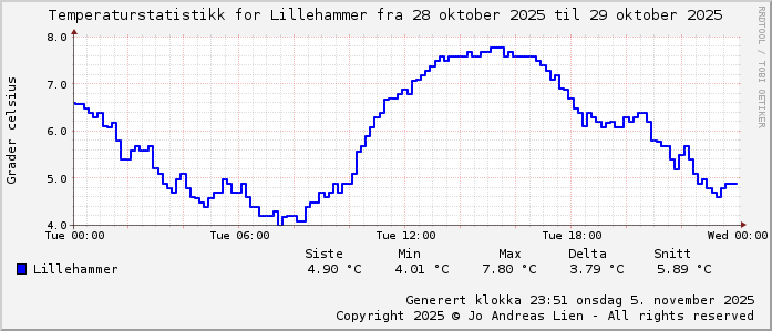 MinTemp 4.0°C (07:35) MaxTemp 7.8°C (15:15) MiddelTemperatur 5.9°C GjennomsnittsTemp 5.9°C (143 avlesninger) Målt på Lillehammer av joli Navnedag: Simen, Simon Stjernetegnet er Skorpionen ![]() Kinesisk år er
