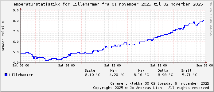 MinTemp 4.2°C (03:25) MaxTemp 8.0°C (23:55) MiddelTemperatur 6.1°C GjennomsnittsTemp 5.7°C (143 avlesninger) Målt på Lillehammer av joli Navnedag: Veslemøy, Vetle Stjernetegnet er Skorpionen ![]() Kinesisk år er