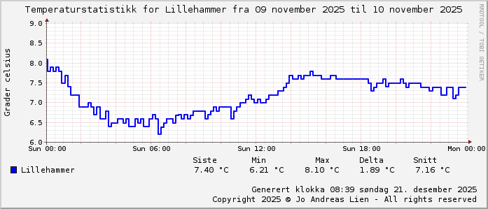 MinTemp 6.2°C (06:35) MaxTemp 8.1°C (00:05) MiddelTemperatur 7.2°C GjennomsnittsTemp 7°C (143 avlesninger) Målt på Lillehammer av joli Navnedag: Teodor, Tordis Stjernetegnet er Skorpionen ![]() Kinesisk år er