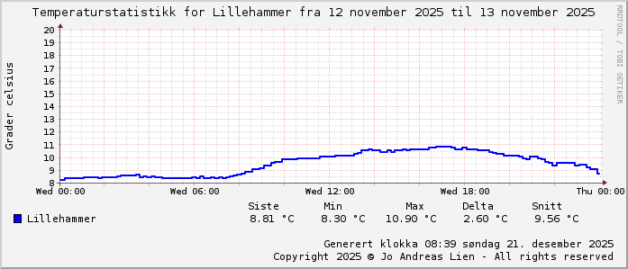 MinTemp 8.3°C (00:05) MaxTemp 10.9°C (16:55) MiddelTemperatur 9.6°C GjennomsnittsTemp 7°C (143 avlesninger) Målt på Lillehammer av joli Navnedag: Torkil, Torkjell Stjernetegnet er Skorpionen ![]() Kinesisk år er