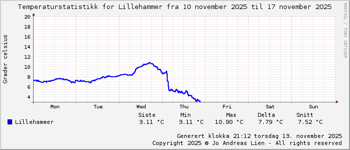 | Laveste temperatur | 3.1°C | 19:15 torsdag 13 november | 2.0°C | 23:55 mandag 11 november | -11.2°C | 23:55 fredag 17 november |