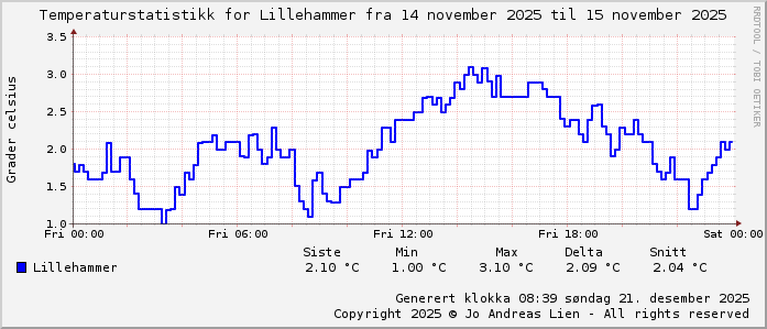 MinTemp 1.0°C (03:25) MaxTemp 3.1°C (14:35) MiddelTemperatur 2.1°C GjennomsnittsTemp 2°C (143 avlesninger) Målt på Lillehammer av joli Navnedag: Fred, Freddy, Fredrik Stjernetegnet er Skorpionen ![]() Kinesisk år er