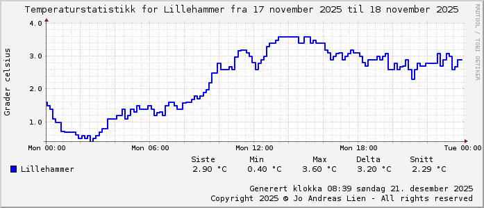 MinTemp 0.4°C (02:45) MaxTemp 3.6°C (13:35) MiddelTemperatur 2°C GjennomsnittsTemp 2.3°C (143 avlesninger) Målt på Lillehammer av joli Navnedag: Hogne, Hugo, Hauk Stjernetegnet er Skorpionen ![]() Kinesisk år er
