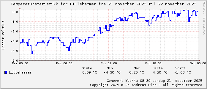 MinTemp -4.3°C (01:45) MaxTemp 0.2°C (21:55) MiddelTemperatur -2.1°C GjennomsnittsTemp -1.7°C (143 avlesninger) Målt på Lillehammer av joli Navnedag: Mariann, Marianne Stjernetegnet er Skorpionen ![]() Kinesisk år er