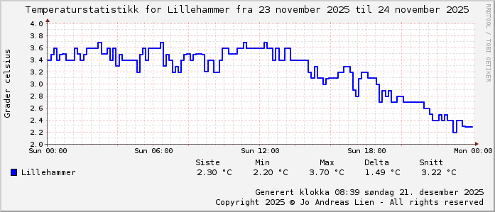 MinTemp 2.2°C (23:05) MaxTemp 3.7°C (03:05) MiddelTemperatur 3°C GjennomsnittsTemp 3.2°C (143 avlesninger) Målt på Lillehammer av joli Navnedag: Klaus, Klement Stjernetegnet er Skytten ![]() Kinesisk år er