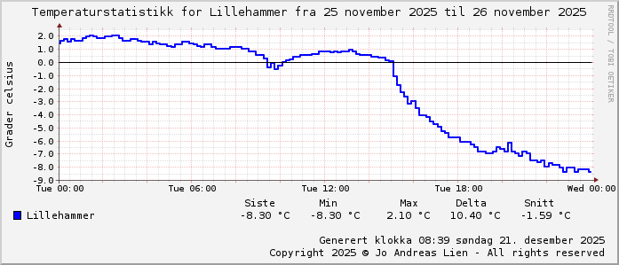 MinTemp -8.3°C (23:25) MaxTemp 2.1°C (01:35) MiddelTemperatur -3.1°C GjennomsnittsTemp -1.5°C (143 avlesninger) Målt på Lillehammer av joli Navnedag: Kari, Katarina, Katrine Stjernetegnet er Skytten ![]() Kinesisk år er