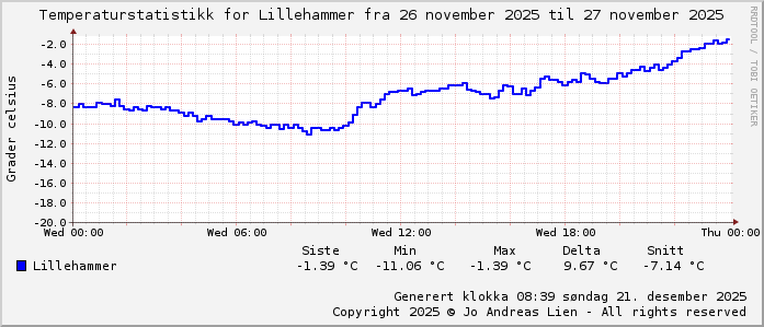 MinTemp -11.1°C (08:45) MaxTemp -1.6°C (23:35) MiddelTemperatur -6.4°C GjennomsnittsTemp -7°C (143 avlesninger) Målt på Lillehammer av joli Navnedag: Konrad, Kurt Stjernetegnet er Skytten ![]() Kinesisk år er