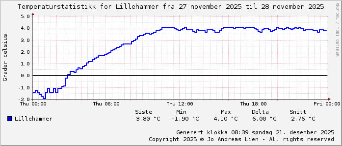 MinTemp -1.9°C (01:05) MaxTemp 4.1°C (10:45) MiddelTemperatur 1.1°C GjennomsnittsTemp 2.8°C (143 avlesninger) Målt på Lillehammer av joli Navnedag: Torlaug, Torleif Stjernetegnet er Skytten ![]() Kinesisk år er