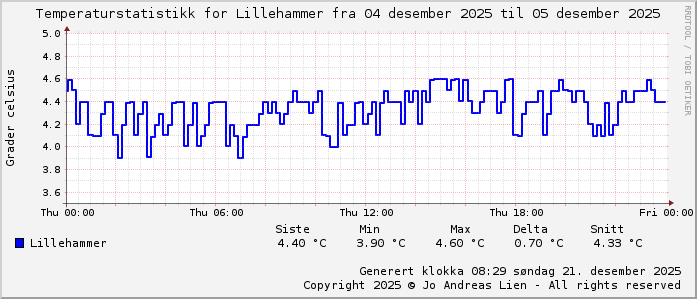MinTemp 3.9°C (02:15) MaxTemp 4.6°C (00:15) MiddelTemperatur 4.3°C GjennomsnittsTemp 4.3°C (143 avlesninger) Målt på Lillehammer av joli Navnedag: Barbara, Barbro Stjernetegnet er Skytten ![]() Kinesisk år er