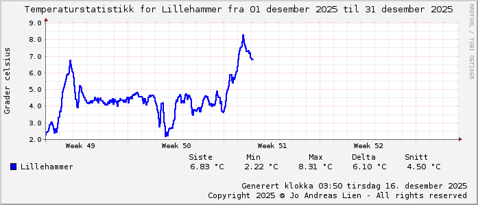 | Høyeste temperatur | 7.9°C | 09:35 mandag 15 desember | 9.2°C | 17:45 søndag 01 desember | 3.1°C | 06:35 tirsdag 19 desember |