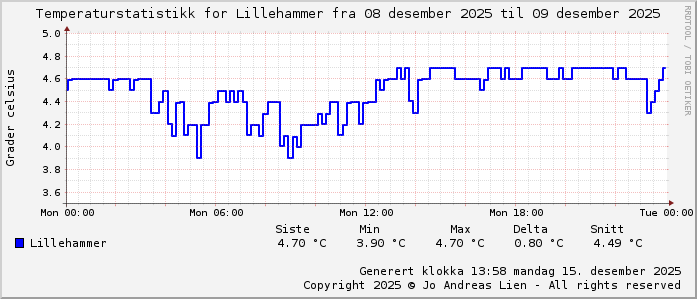 MinTemp 3.9°C (05:25) MaxTemp 4.7°C (13:25) MiddelTemperatur 4.3°C GjennomsnittsTemp 4.5°C (143 avlesninger) Målt på Lillehammer av joli Navnedag: Marion, Morgan, Marlene Stjernetegnet er Skytten ![]() Kinesisk år er