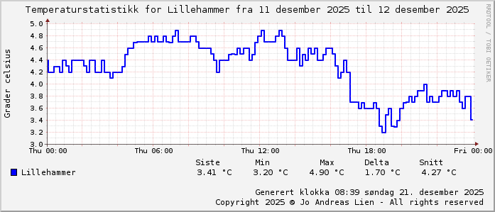 MinTemp 3.2°C (19:05) MaxTemp 4.9°C (07:25) MiddelTemperatur 4.1°C GjennomsnittsTemp 4.3°C (143 avlesninger) Målt på Lillehammer av joli Navnedag: Dan, Daniel Stjernetegnet er Skytten ![]() Kinesisk år er