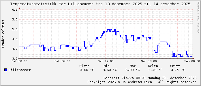 MinTemp 3.6°C (21:25) MaxTemp 5.0°C (12:25) MiddelTemperatur 4.3°C GjennomsnittsTemp 4.3°C (143 avlesninger) Målt på Lillehammer av joli Navnedag: Lucia, Lydia Stjernetegnet er Skytten ![]() Kinesisk år er