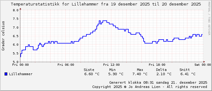 MinTemp 5.3°C (00:05) MaxTemp 7.4°C (10:35) MiddelTemperatur 6.4°C GjennomsnittsTemp 6.4°C (143 avlesninger) Målt på Lillehammer av joli Navnedag: Isak, Iselin Stjernetegnet er Skytten ![]() Kinesisk år er
