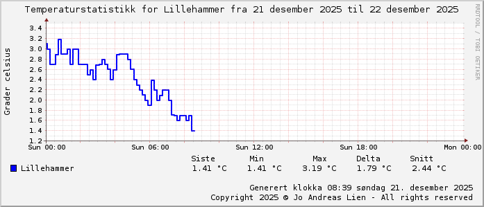 Temp 2.2°C og Vind 0.0m/s Oppdatert klokka 06:55 MinTemp 1.9°C (06:05) MaxTemp 3.2°C (00:55) MiddelTemperatur 2.6°C GjennomsnittsTemp 2.6°C (41 avlesninger)