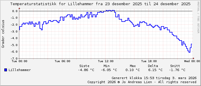 MinTemp -6.1°C (23:45) MaxTemp 0.1°C (12:15) MiddelTemperatur -3°C GjennomsnittsTemp -1.7°C (143 avlesninger) Målt på Lillehammer av joli Navnedag: Sigurd, Sjur Stjernetegnet er Stenbukken ![]() Kinesisk år er