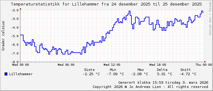 MinTemp -7.1°C (03:55) MaxTemp -2.1°C (23:55) MiddelTemperatur -4.6°C GjennomsnittsTemp -4.7°C (143 avlesninger) Målt på Lillehammer av joli Navnedag: Adam, Eva Stjernetegnet er Stenbukken ![]() Kinesisk år er