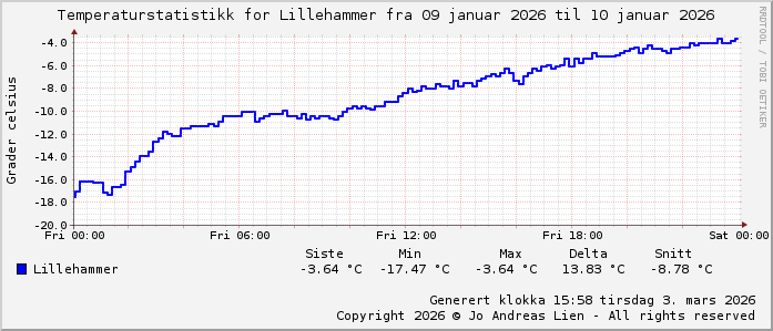 MinTemp -17.5°C (00:05) MaxTemp -3.6°C (23:25) MiddelTemperatur -10.6°C GjennomsnittsTemp -7°C (143 avlesninger) Målt på Lillehammer av joli Navnedag: Gunn, Gunnar Stjernetegnet er ![]() Kinesisk år er