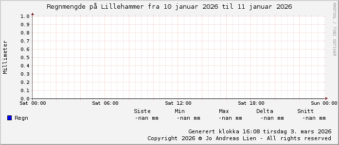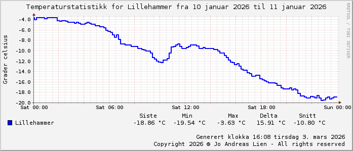 MinTemp -19.5°C (22:55) MaxTemp -3.6°C (00:05) MiddelTemperatur -11.6°C GjennomsnittsTemp -7°C (143 avlesninger) Målt på Lillehammer av joli Navnedag: Sigmund, Sigrun Stjernetegnet er ![]() Kinesisk år er