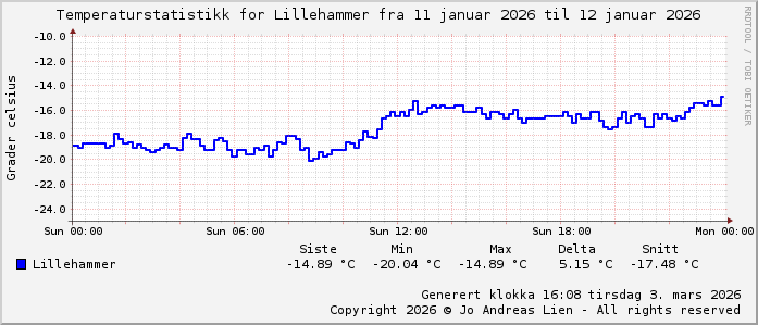 MinTemp -20.1°C (08:55) MaxTemp -15.2°C (12:45) MiddelTemperatur -17.7°C GjennomsnittsTemp -7°C (143 avlesninger) Målt på Lillehammer av joli Navnedag: Børge, Børre Stjernetegnet er ![]() Kinesisk år er