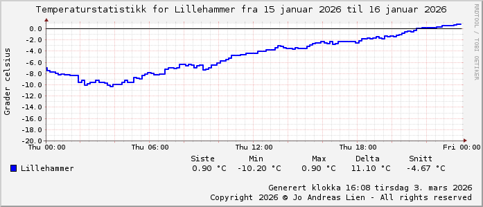 MinTemp -10.2°C (03:55) MaxTemp 0.9°C (23:55) MiddelTemperatur -4.7°C GjennomsnittsTemp -4.7°C (143 avlesninger) Målt på Lillehammer av joli Navnedag: Laura, Laurits Stjernetegnet er ![]() Kinesisk år er