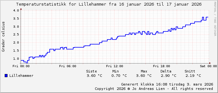 MinTemp 0.7°C (00:55) MaxTemp 3.6°C (23:25) MiddelTemperatur 2.2°C GjennomsnittsTemp 2.2°C (143 avlesninger) Målt på Lillehammer av joli Navnedag: Hilmar, Hjalmar Stjernetegnet er ![]() Kinesisk år er