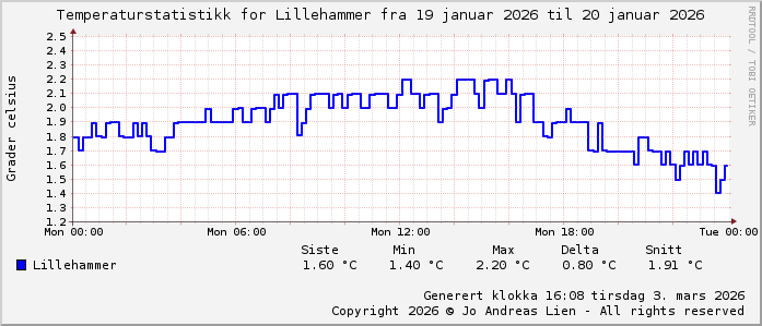 MinTemp 1.4°C (23:45) MaxTemp 2.2°C (12:15) MiddelTemperatur 1.8°C GjennomsnittsTemp 1.9°C (143 avlesninger) Målt på Lillehammer av joli Navnedag: Margunn, Marius Stjernetegnet er ![]() Kinesisk år er